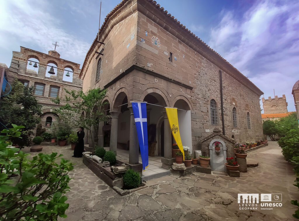 Between the settlements of Sigri, Antissa and Eresos, the men’s monastery of Agios Ioannis built on the highest peak of western Lesbos, Ordymnos – hence its name, stands tall like a military observatory overlooking the western part of the island. Its fortress architecture creates from the beginning the impression that the place functioned throughout history as a defensive fortress, which offered shelter to the inhabitants of the surrounding area.